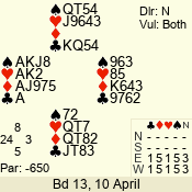 Con | Dc | Res | Score | Ld | Pairs | Rd | Tbl | 3 NT | N | +2 | 660 | 4 | 04 - 07 | 8 | 3 |