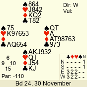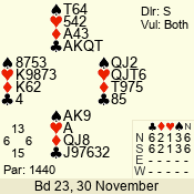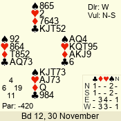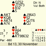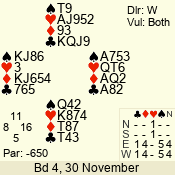 Con | Dc | Res | Score | Ld | Pairs | Rd | Tbl | 3 NT | S | +1 | 630 | 5 | 10 - 04 | 2 | 4 |
