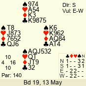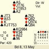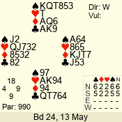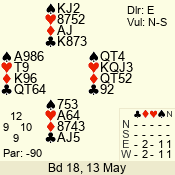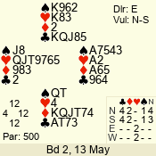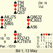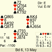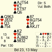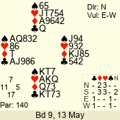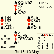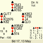 | Con | Dc | Res | Score | Ld | Pairs | Rd | Tbl | | 2 N | E | -3 | 150 | 5 | 03 - 07 | 5 | 3 |
