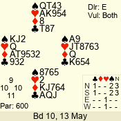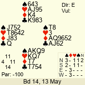 | Con | Dc | Res | Score | Ld | Pairs | Rd | Tbl | | 3 N | E | -1 | 100 | 3 | 03 - 04 | 8 | 3 |