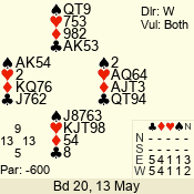 | Con | Dc | Res | Score | Ld | Pairs | Rd | Tbl | | 3 N | N | = | 600 | A | 07 - 06 | 2 | 7 |