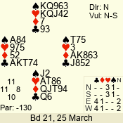 Con | Dc | Res | Score | Ld | Pairs | Rd | Tbl | 1 NT | S | +4 | 210 | 9 | 05 - 12 | 7 | 5 |