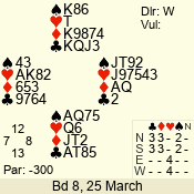 Con | Dc | Res | Score | Ld | Pairs | Rd | Tbl | 3 NT | E | -2 | 200 | 4 | 10 - 08 | 3 | 10 |
