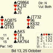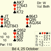Con | Dc | Res | Score | Ld | Pairs | Rd | Tbl | 3 NT | S | +1 | 430 | 7 | 04 - 04 | 1 | 4 |