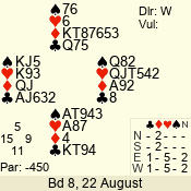 Con | Dc | Res | Score | Ld | Pairs | Rd | Tbl | 2 NT | W | -4 | 400 | 2 | 08 - 07 | 2 | 8 |