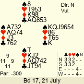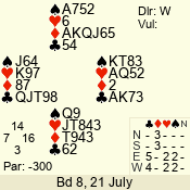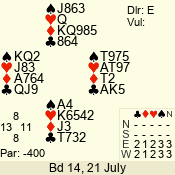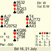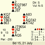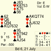 Con | Dc | Res | Score | Ld | Pairs | Rd | Tbl | 3 NT x | E | -3 | 500 | 3 | 03 - 02 | 2 | 3 |