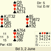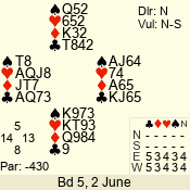 Con | Dc | Res | Score | Ld | Pairs | Rd | Tbl | 3 N | S | +1 | 430 | A | 01 - 03 | 6 | 1 |