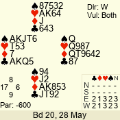 Con | Dc | Res | Score | Ld | Pairs | Rd | Tbl | 3 NT | S | = | 600 | 5 | 08 - 12 | 10 | 8 |