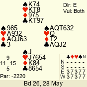 Con | Dc | Res | Score | Ld | Pairs | Rd | Tbl | 7 NT | S | = | 2220 | 3 | 01 - 03 | 12 | 1 |