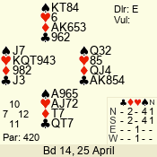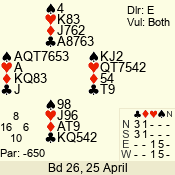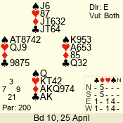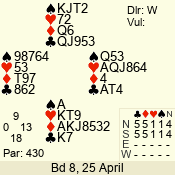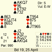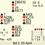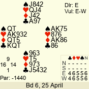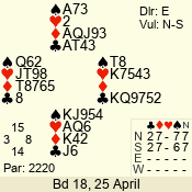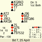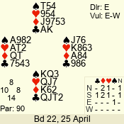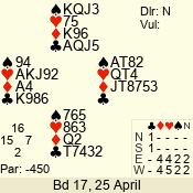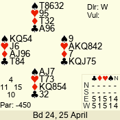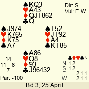Con | Dc | Res | Score | Ld | Pairs | Rd | Tbl | 3 NT | W | -4 | 400 | K | 07 - 10 | 9 | 7 |