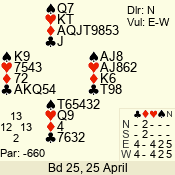 Con | Dc | Res | Score | Ld | Pairs | Rd | Tbl | 3 NT | N | +2 | 660 | 4 | 11 - 01 | 13 | 11 |