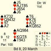 | Con | Dc | Res | Score | Ld | Pairs | Rd | Tbl | | 3 NT | W | -1 | 100 | 2 | 07 - 10 | 8 | 7 |