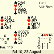 Con | Dc | Res | Score | Ld | Pairs | Rd | Tbl | 3 NT | E | -2 | 100 | 6 | 12 - 07 | 6 | 4 |