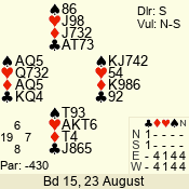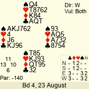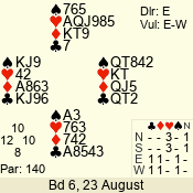 Con | Dc | Res | Score | Ld | Pairs | Rd | Tbl | 3 NT | E | -3 | 150 | Q | 09 - 06 | 6 | 1 |
