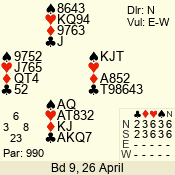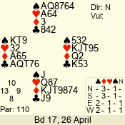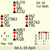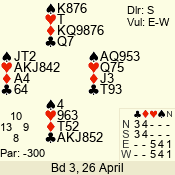 Con | Dc | Res | Score | Ld | Pairs | Rd | Tbl | 3 NT | S | +3 | 690 | 2 | 04 - 05 | 9 | 4 |