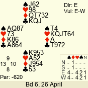 Con | Dc | Res | Score | Ld | Pairs | Rd | Tbl | 3 NT | E | -1 | 50 | 6 | 04 - 05 | 9 | 4 |