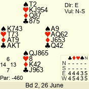 Con | Dc | Res | Score | Ld | Pairs | Rd | Tbl | 3 NT | S | +2 | 460 | J | 02 - 01 | 2 | 2 |