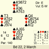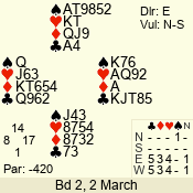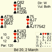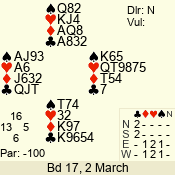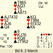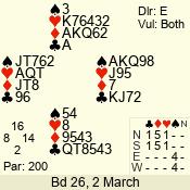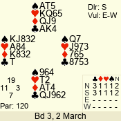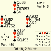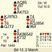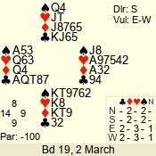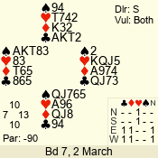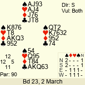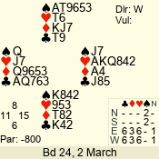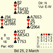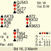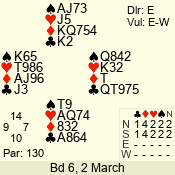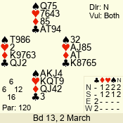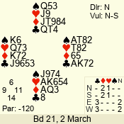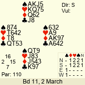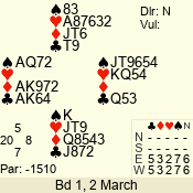 | Con | Dc | Res | Score | Ld | Pairs | Rd | Tbl | | 1 NT | S | +2 | 150 | T | 06 - 07 | 11 | 6 |