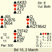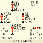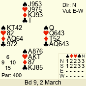 | Con | Dc | Res | Score | Ld | Pairs | Rd | Tbl | | 3 NT | N | = | 400 | 5 | 04 - 06 | 10 | 4 |
