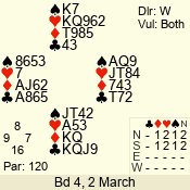 | Con | Dc | Res | Score | Ld | Pairs | Rd | Tbl | | 3 NT | S | = | 600 | 3 | 04 - 04 | 12 | 4 |