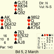 | Con | Dc | Res | Score | Ld | Pairs | Rd | Tbl | | 3 NT | N | +1 | 430 | 3 | 05 - 06 | 11 | 5 |