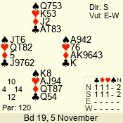Con | Dc | Res | Score | Ld | Pairs | Rd | Tbl | 2 NT | S | = | 120 | A | 04 - 04 | 11 | 4 |