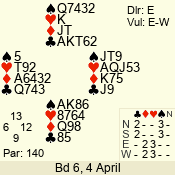 Con | Dc | Res | Score | Ld | Pairs | Rd | Tbl | 6 NT | W | -3 | 300 | 8 | 04 - 05 | 8 | 4 |