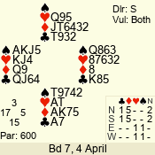 Con | Dc | Res | Score | Ld | Pairs | Rd | Tbl | 3 NT | N | = | 600 | 5 | 04 - 07 | 6 | 4 |