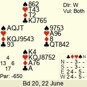 Con | Dc | Res | Score | Ld | Pairs | Rd | Tbl | 4 NT | W | -6 | 600 | 3 | 01 - 03 | 7 | 1 |