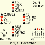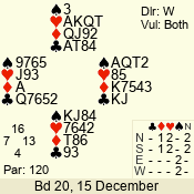 Con | Dc | Res | Score | Ld | Pairs | Rd | Tbl | 1 NT | S | +1 | 120 | A | 06 - 06 | 12 | 6 |