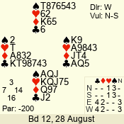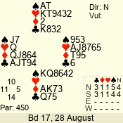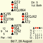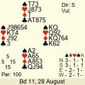 Con | Dc | Res | Score | Ld | Pairs | Rd | Tbl | 3 NT | E | -4 | 400 | 7 | 11 - 11 | 1 | 11 |