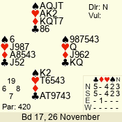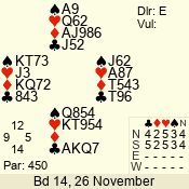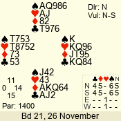 Con | Dc | Res | Score | Ld | Pairs | Rd | Tbl | 3 NT | N | = | 400 | 6 | 02 - 02 | 1 | 2 |