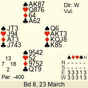 Con | Dc | Res | Score | Ld | Pairs | Rd | Tbl | 3 NT | N | = | 400 | K | 07 - 05 | 3 | 7 |
