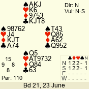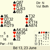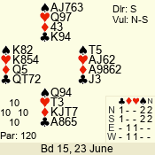 Con | Dc | Res | Score | Ld | Pairs | Rd | Tbl | 1 NT | N | +1 | 120 | 4 | 04 - 05 | 7 | 4 |