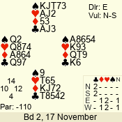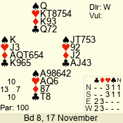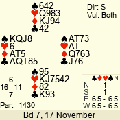 | Con | Dc | Res | Score | Ld | Pairs | Rd | Tbl | | 3 N | N | +1 | 630 | 6 | 05 - 15 | 25 | 5 |