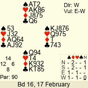 | Con | Dc | Res | Score | Ld | Pairs | Rd | Tbl | | 3 NT | W | -1 | 50 | 3 | 16 - 16 | 1 | 16 |