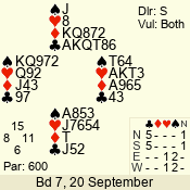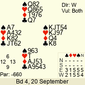 Con | Dc | Res | Score | Ld | Pairs | Rd | Tbl | 3 NT | S | +2 | 660 | 6 | 09 - 07 | 7 | 1 |