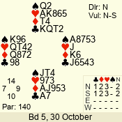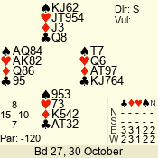 Con | Dc | Res | Score | Ld | Pairs | Rd | Tbl | 2 NT | N | +2 | 180 | 8 | 05 - 02 | 4 | 5 |