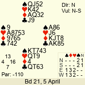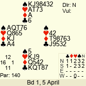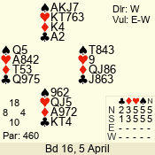 Con | Dc | Res | Score | Ld | Pairs | Rd | Tbl | 3 NT | N | +2 | 460 | 4 | 01 - 05 | 3 | 1 |
