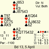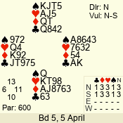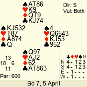 Con | Dc | Res | Score | Ld | Pairs | Rd | Tbl | 3 NT | N | = | 600 | A | 04 - 01 | 4 | 4 |