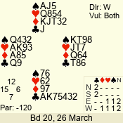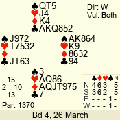 Con | Dc | Res | Score | Ld | Pairs | Rd | Tbl | 3 NT | S | +3 | 690 | 4 | 09 - 06 | 4 | 9 |