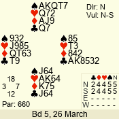 Con | Dc | Res | Score | Ld | Pairs | Rd | Tbl | 3 NT | S | +2 | 660 | T | 07 - 11 | 10 | 7 |