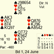 Con | Dc | Res | Score | Ld | Pairs | Rd | Tbl | 3 NT | N | +2 | 460 | 6 | 05 - 08 | 7 | 5 |