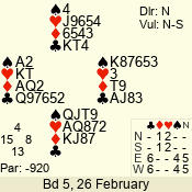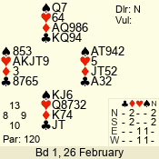 Con | Dc | Res | Score | Ld | Pairs | Rd | Tbl | 2 NT | S | = | 120 | 3 | 05 - 07 | 9 | 5 |