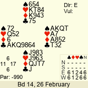 Con | Dc | Res | Score | Ld | Pairs | Rd | Tbl | 3 NT | E | -1 | 50 | K | 02 - 10 | 3 | 2 |
