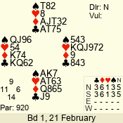 Con | Dc | Res | Score | Ld | Pairs | Rd | Tbl | 1 NT | N | +1 | 120 | 5 | 08 - 08 | 1 | 8 |