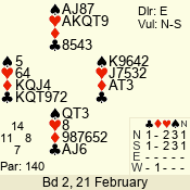 Con | Dc | Res | Score | Ld | Pairs | Rd | Tbl | 1 NT | S | +2 | 150 | 7 | 04 - 06 | 11 | 4 |