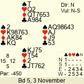 Con | Dc | Res | Score | Ld | Pairs | Rd | Tbl | 4  | N | +1 | 450 | A | 05 - 03 | 3 | 5 |