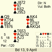 Con | Dc | Res | Score | Ld | Pairs | Rd | Tbl | 1 N | S | +1 | 120 | 8 | 04 - 05 | 7 | 4 |