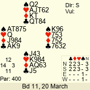 | Con | Dc | Res | Score | Ld | Pairs | Rd | Tbl | | 3 NT | N | +2 | 660 | 7 | 11 - 03 | 10 | 4 |